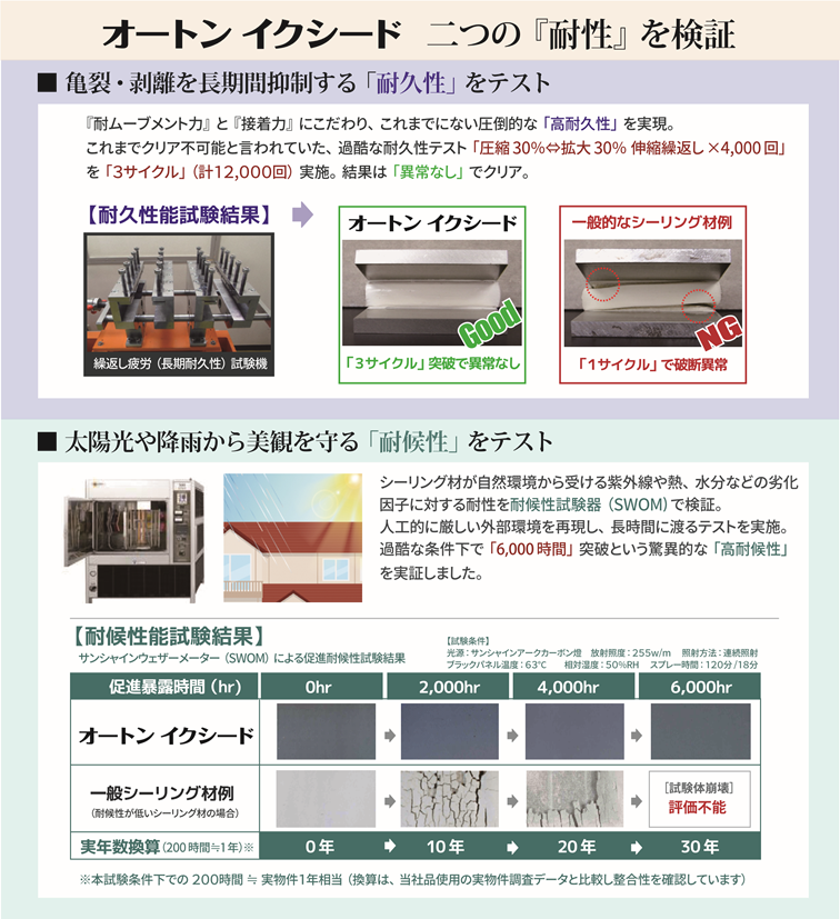 そこで2014年頃に開発されたのが「オートンイクシード」、当初は「イクシード15+」という商品名でした。この「15+」という意味は15年以上の耐久性がありますよ。という意味ですが現在では改良に改良が加えられ施工性の向上とともに耐久性が30年となったようです。そこで15+という表記が消え「イクシード」という商品に生まれ変わりました。