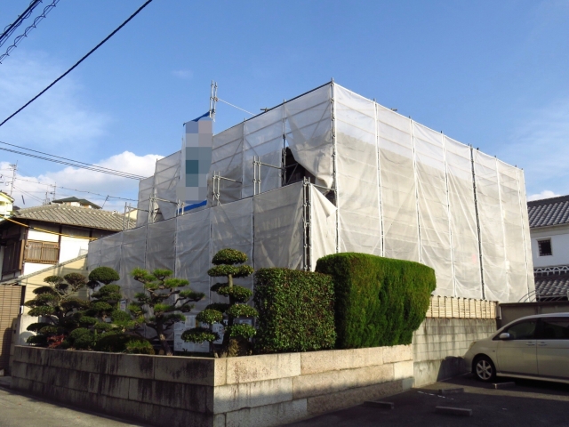外壁塗装工事中は、足場とシートで家が囲まれます。