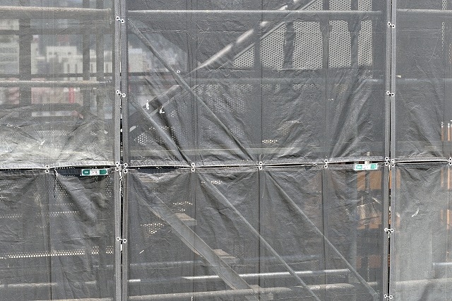 足場の外から覆うので、塗装業者の方が作業しやすいよう通気性があるものが多いです。