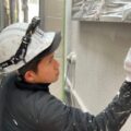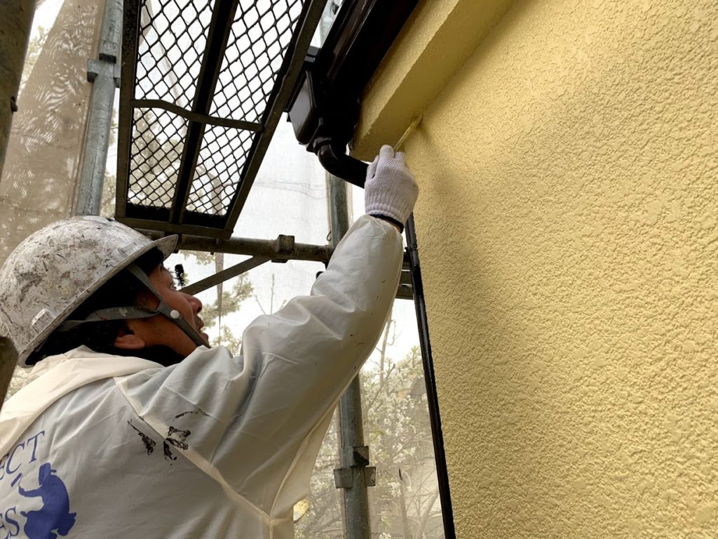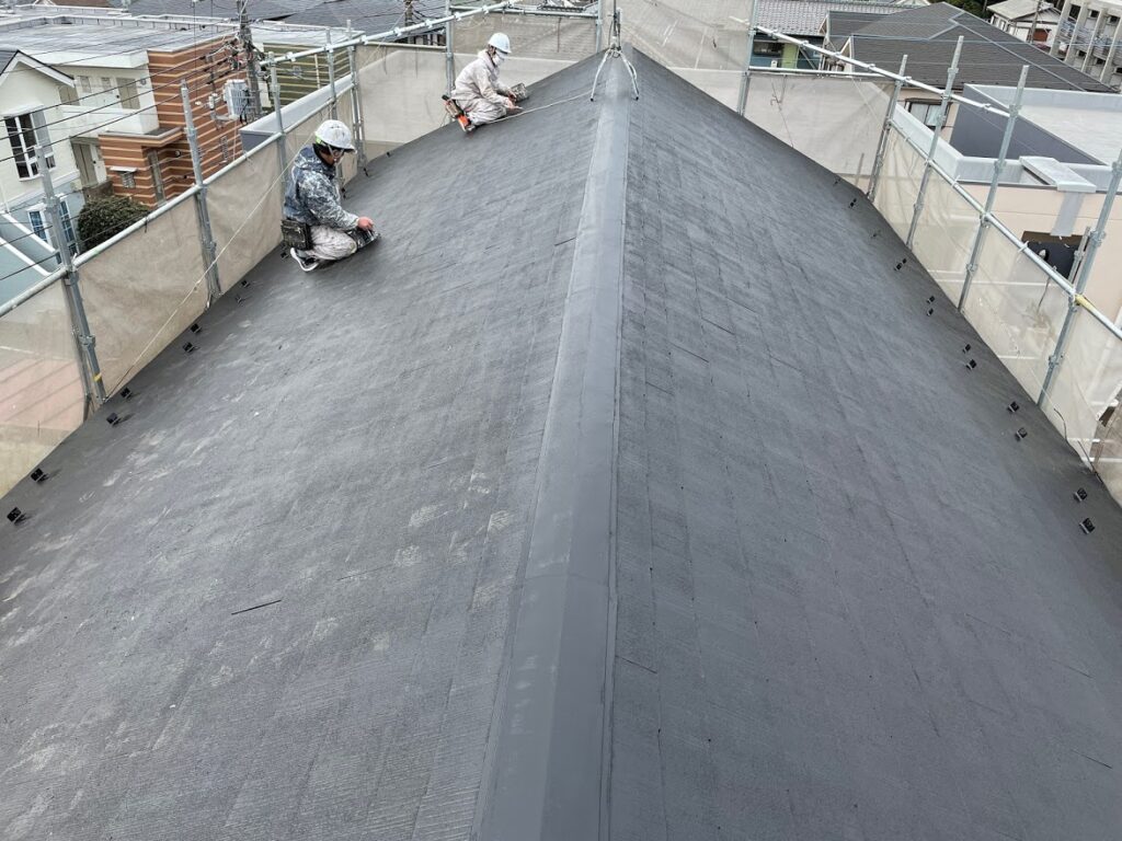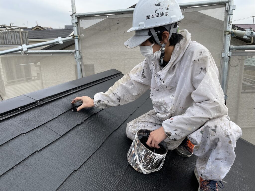 本日は軒天の上塗り、屋根の縁切りタスペーサーの取付け、その後屋根中塗り作業を行いました。