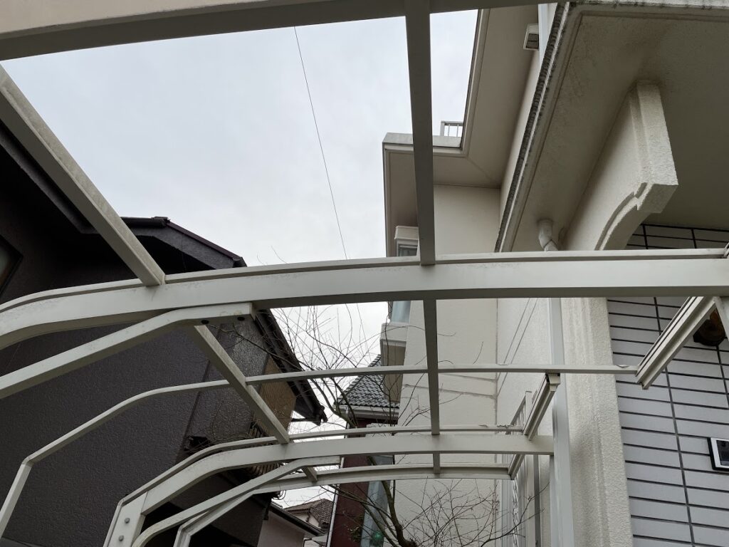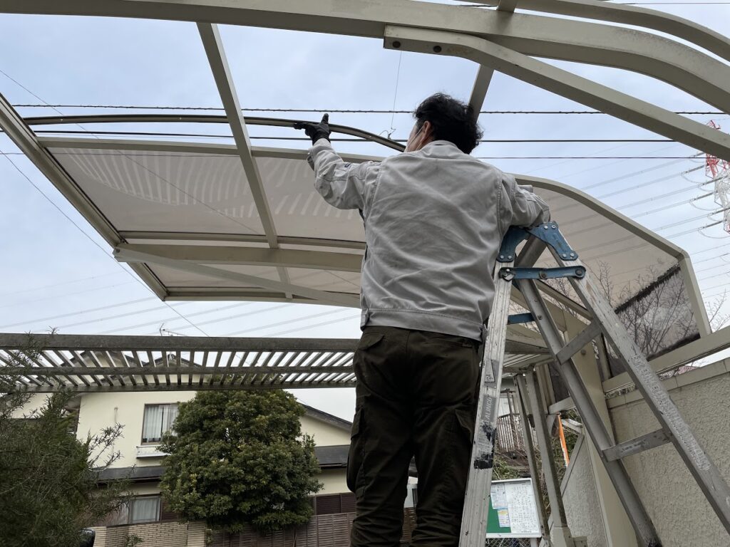 月曜日に足場を組む予定ですが、カーポートが建物に隣接している為、足場設置部分のアクリル板を取り外す作業やお家の周りの荷物などの移動を行いました。