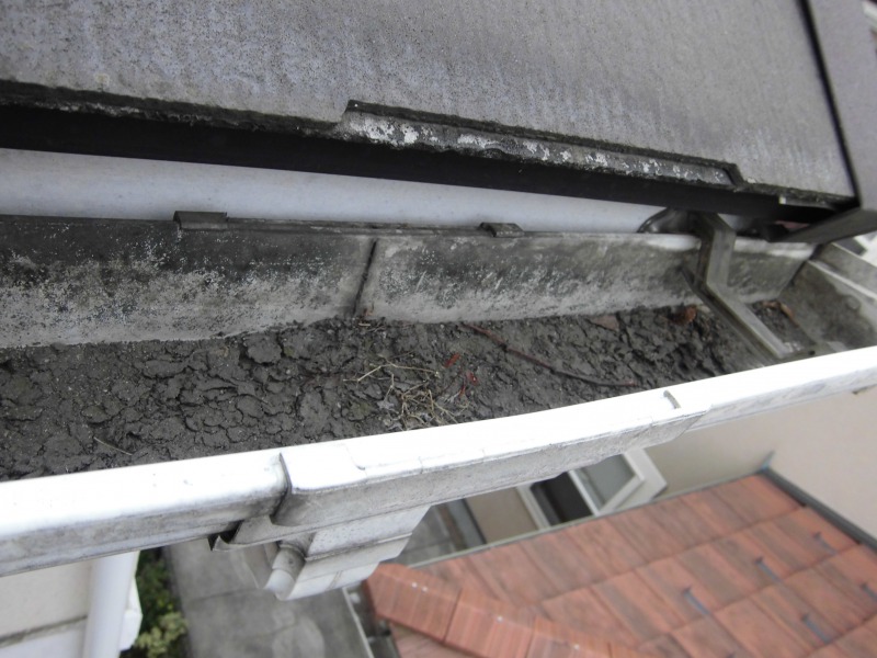 はしごで屋根に上がって雨樋を覗いてみると、枯葉ではなく長年の汚れや水垢が雨水とともに