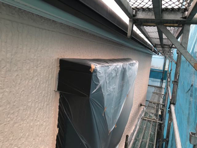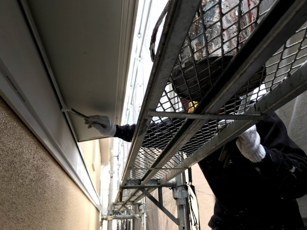本日の作業は外壁の仕上げ塗り、付帯部の下塗り作業を行いました。 狭いところも下塗りからキッチリと塗装していきます。