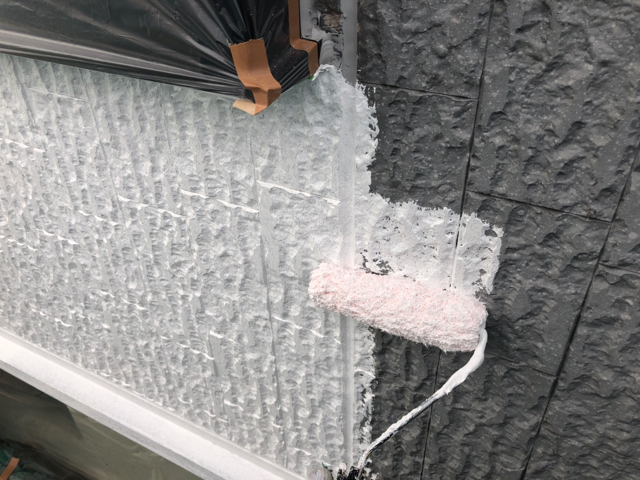 こちらのお宅はシーリングの量がとても多かったので、シーリングの打替え作業だけで数日かかり、ようやく先日より塗装作業に入りました。