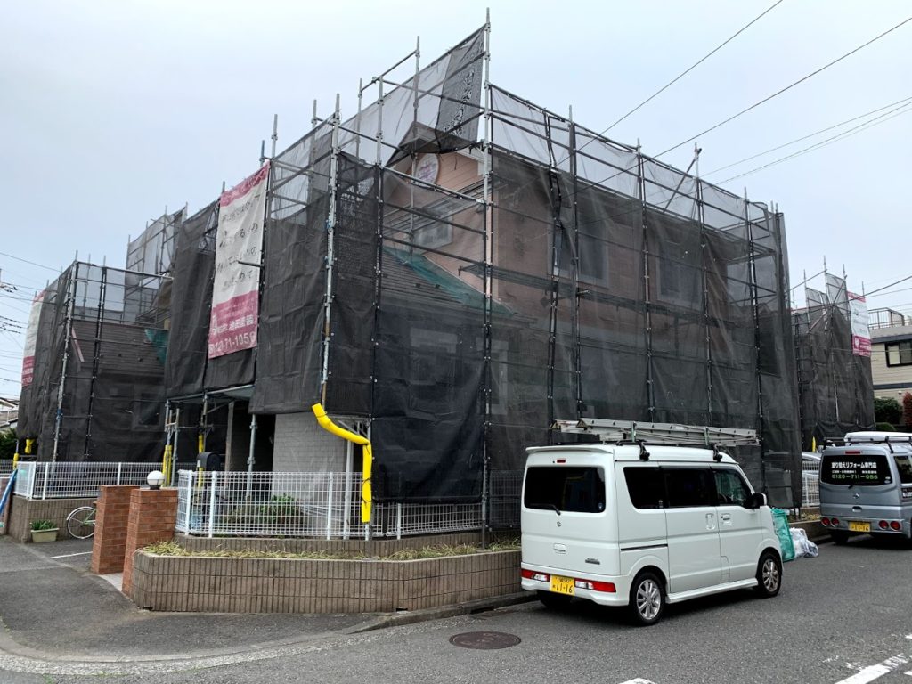 こちらのお宅は少し落ち着いたグリーン系で3件ともそれぞれバランスよく色変えをしました。足場の解体が楽しみです♪