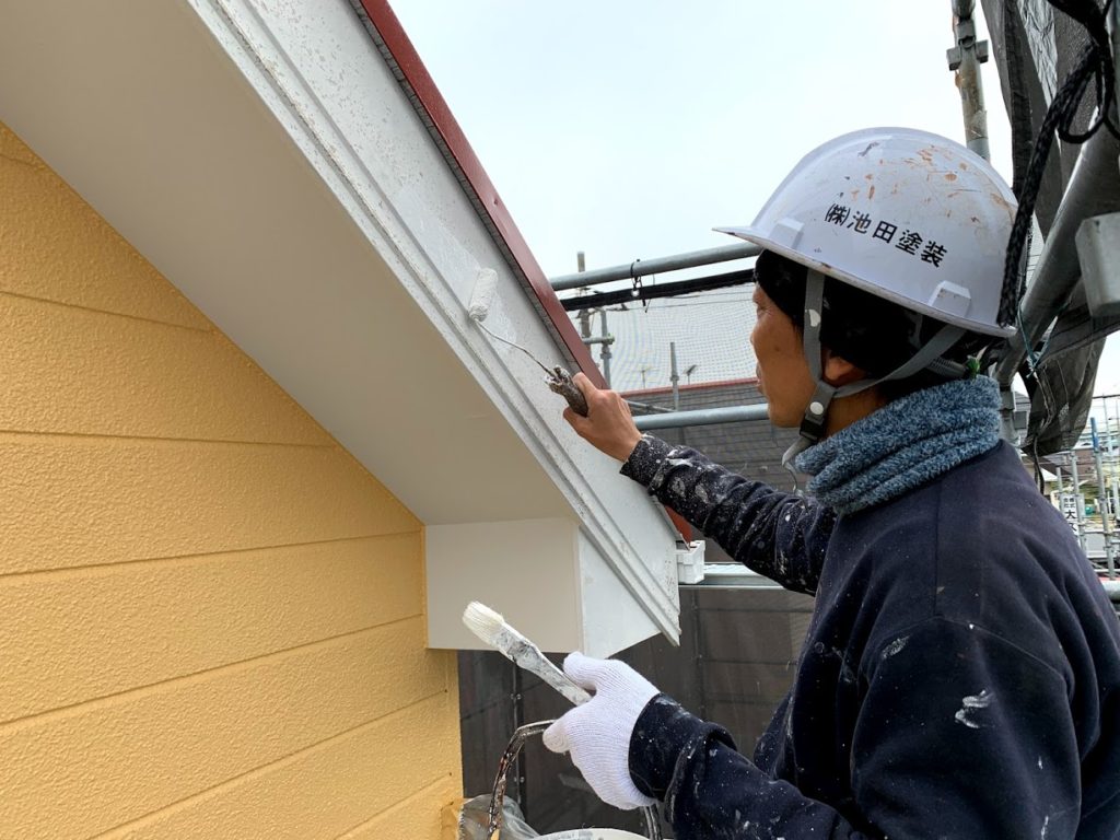 上記は破風板というところの下塗りを行っている様子です。外壁はイエロー系の明るい色合いになっています。