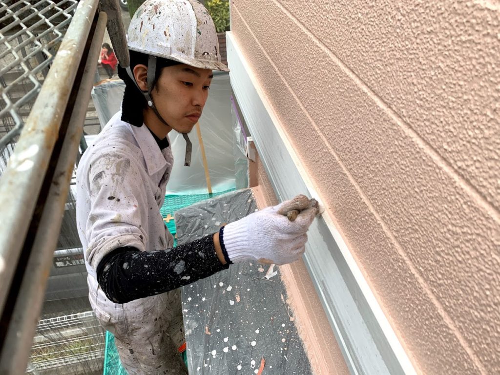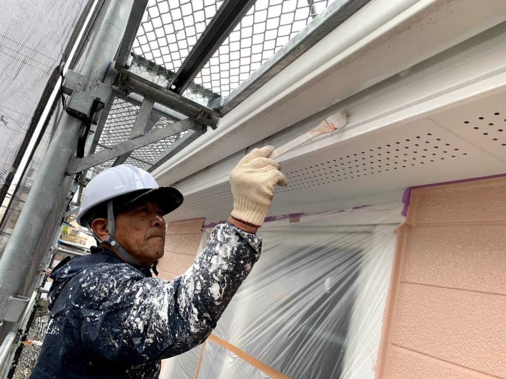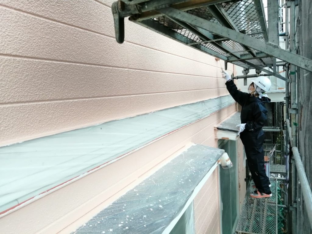 2件目のこちらも午前中は外壁の上塗りを行い、午後からは破風、幕板などの付帯部の下塗りを行いました。こちらの外壁はピンク系の外壁です。