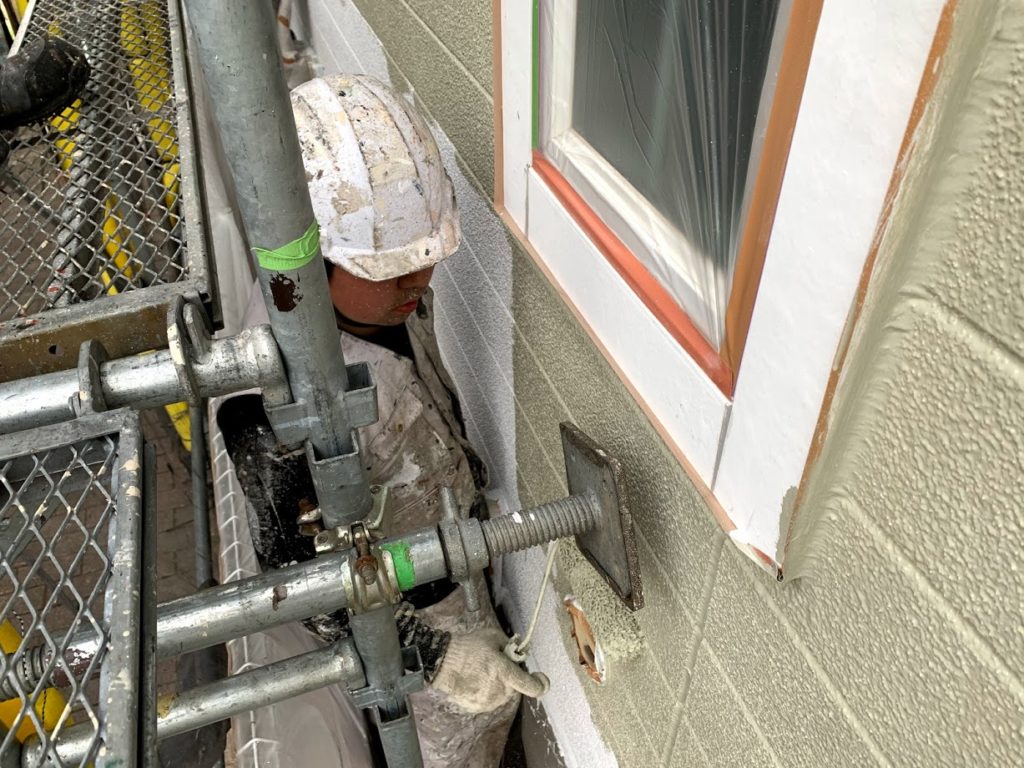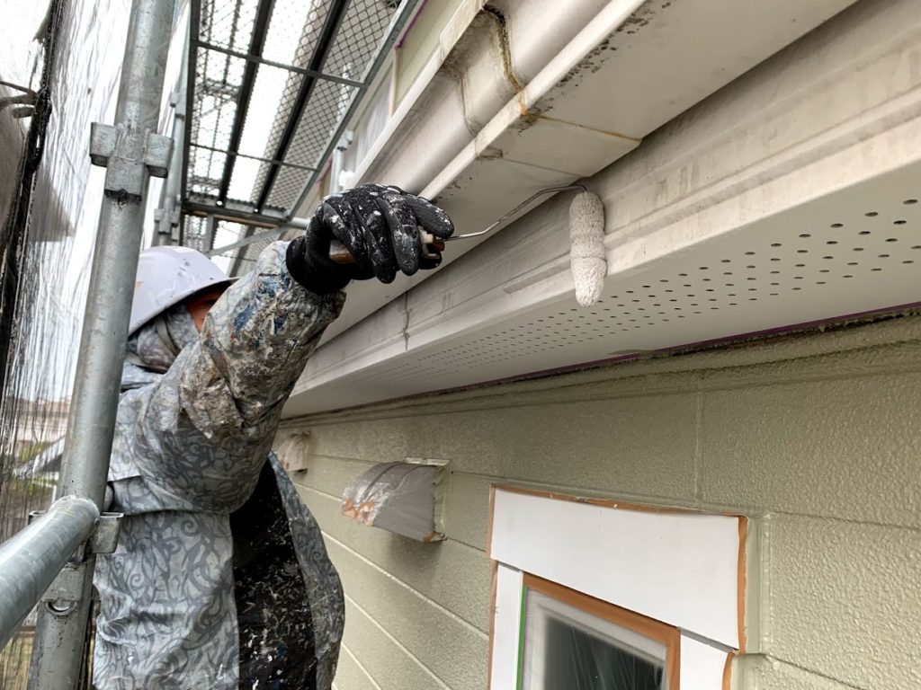 三件目のこちらは外壁の中塗り、一部上塗りと付帯部の下塗り作業を行いました。