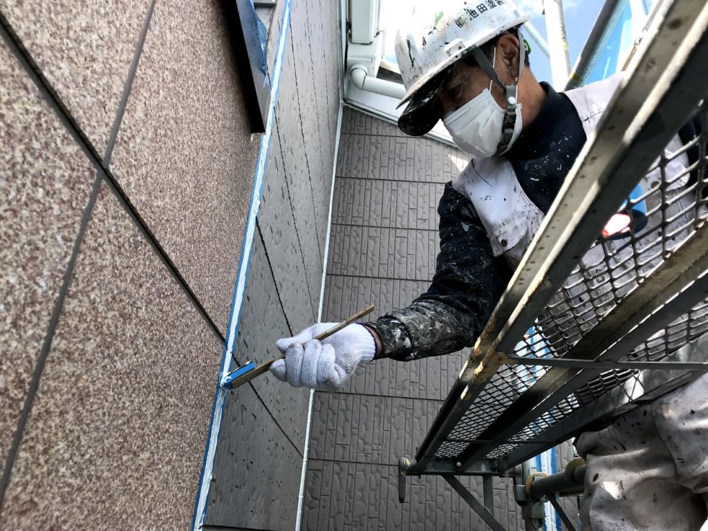 シーリング工事は塗装してしまうと見えなくなってしまう部分ですが、雨水の建物への侵入を防ぐためのとても重要な作業です。たっぷりキッチリと充填していきます。