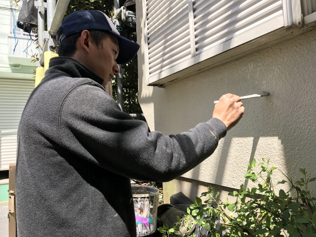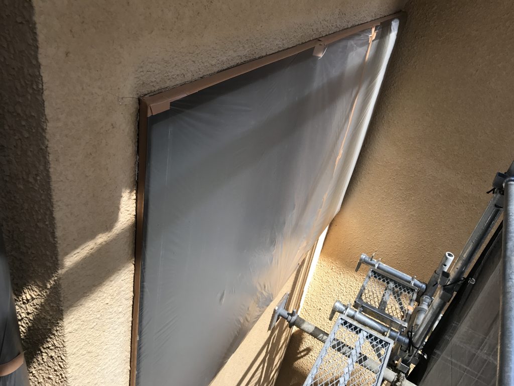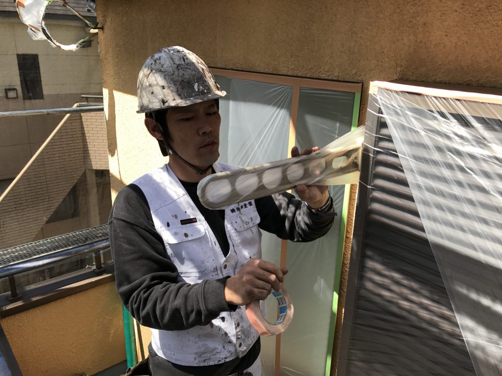 養生(ようじょう)とは塗装の際に窓やサッシなどの塗装しない箇所をビニールやテープで覆うことを言います。