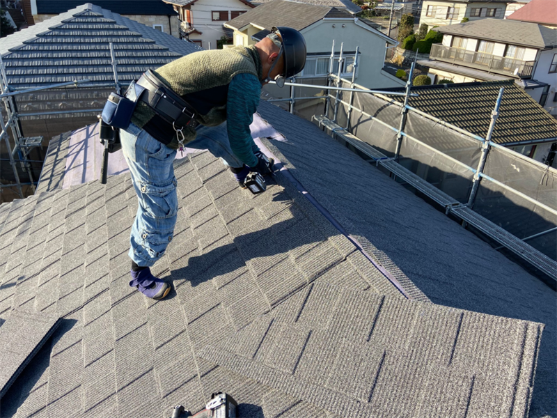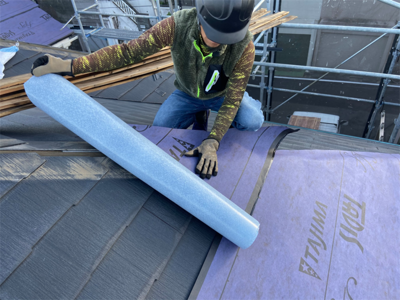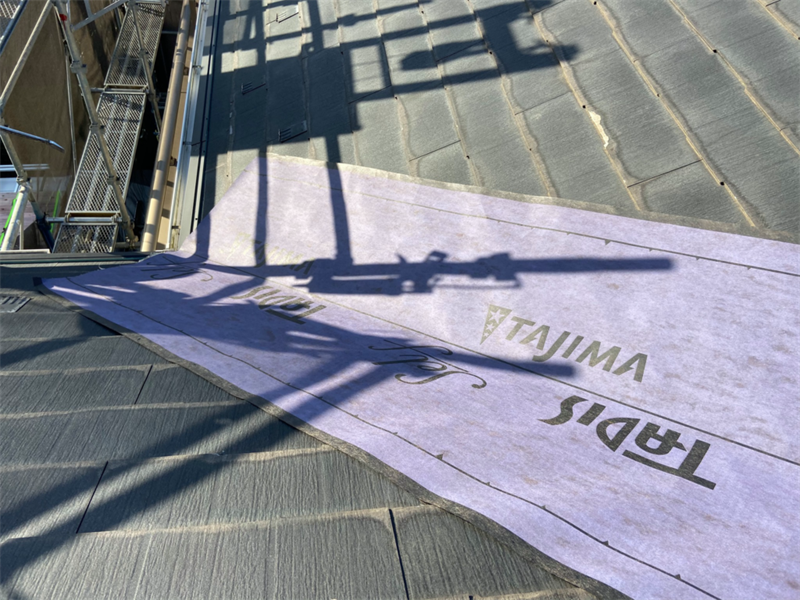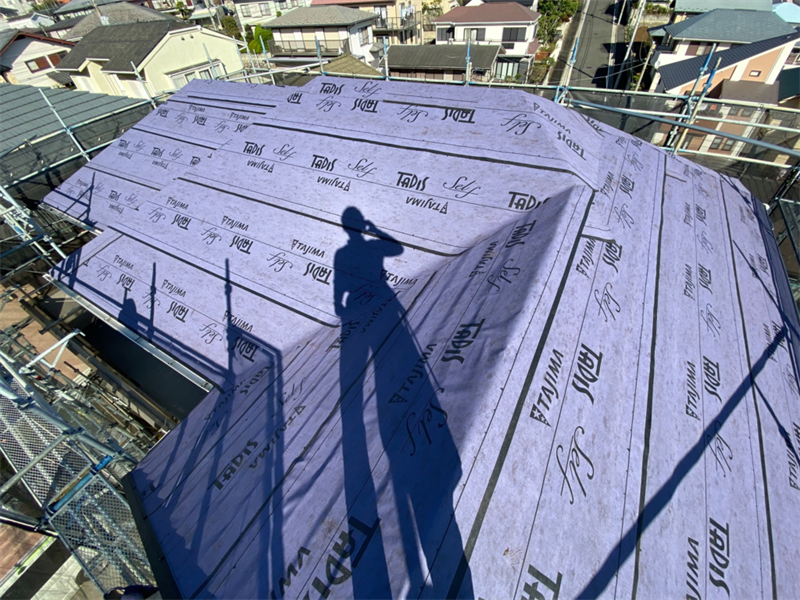 次に屋根のカバー工法を行う際に大切な役割を果たす屋根ルーフィングを貼っていきます。