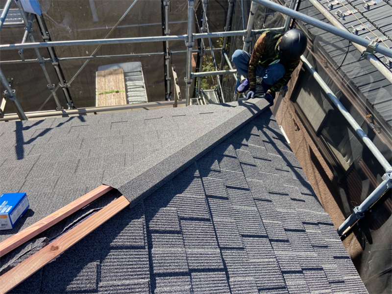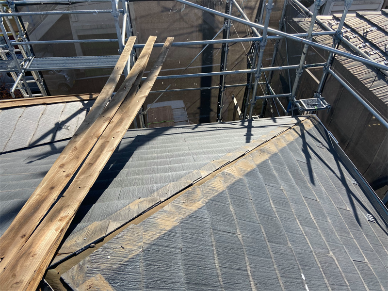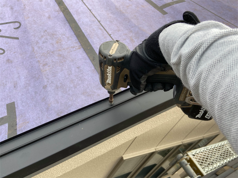 そしていよいよ本体を取り付けていきます。今回使用した屋根材は金属製の天然石チップがちりばめられた高耐久性の金属屋根となります。天然石チップが採用されている事から自然色の為、塗装を今後必要としません。