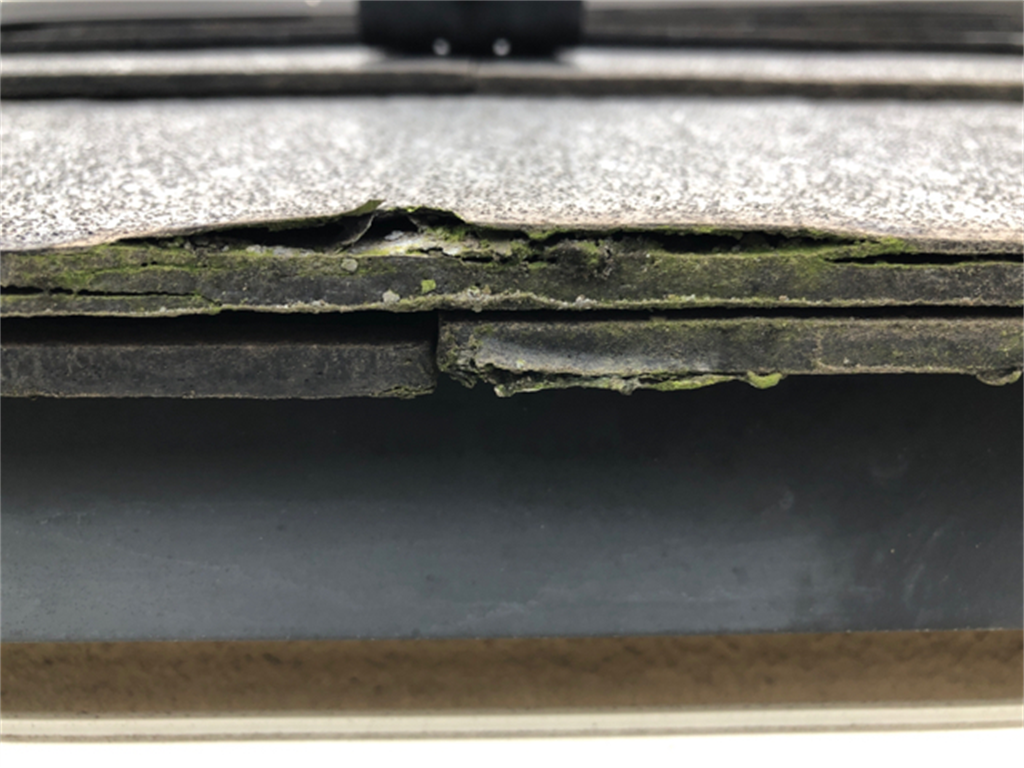 上記の写真のように屋根先端の小口部分を見てみると分かるように、層間剥離しているのがわかります。