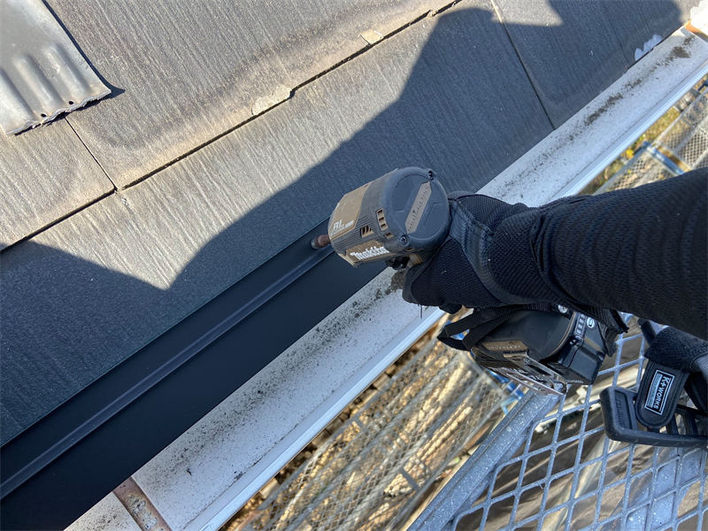 新たな屋根を葺く為の下準備として、軒先といった屋根の先端部に軒先水切りを取り付けます。