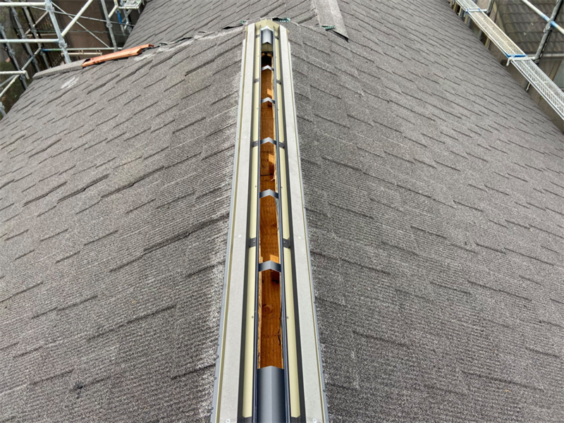 換気棟といって小屋裏の換気を行う為の専用換気棟材を取り付けます。