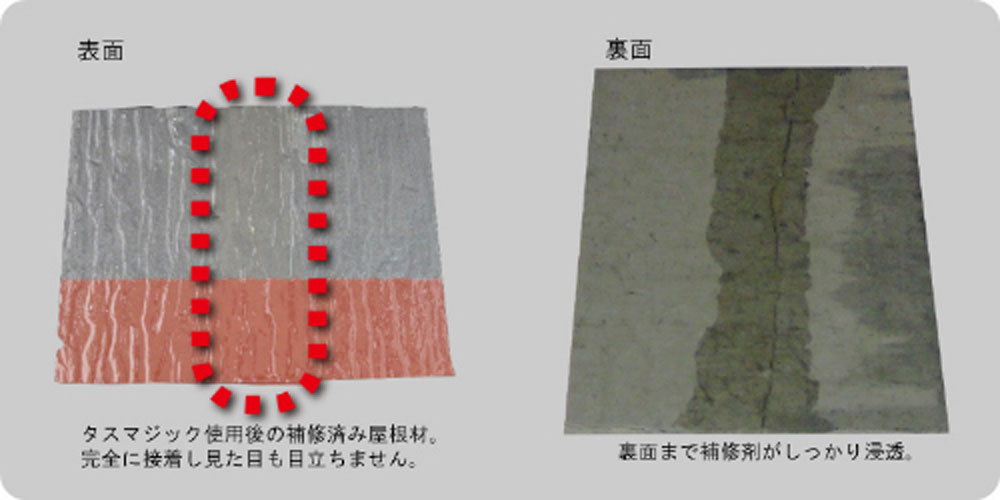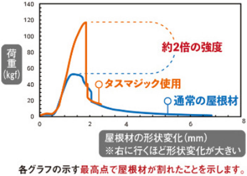 元の屋根材とタスマジックで補修した屋根材との強度を比較した結果、タスマジックの強力な接着力により補修した屋根材は、補修する前の屋根材より約2倍の強度があることが、実験にて証明されました。