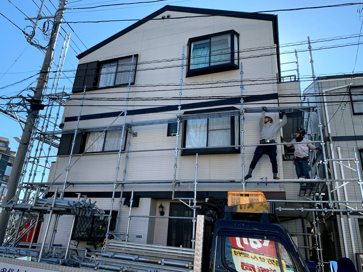 足場を組んだ後は、塗料が近所に飛び散らないようにするため飛散防止のネットで足場を覆います。