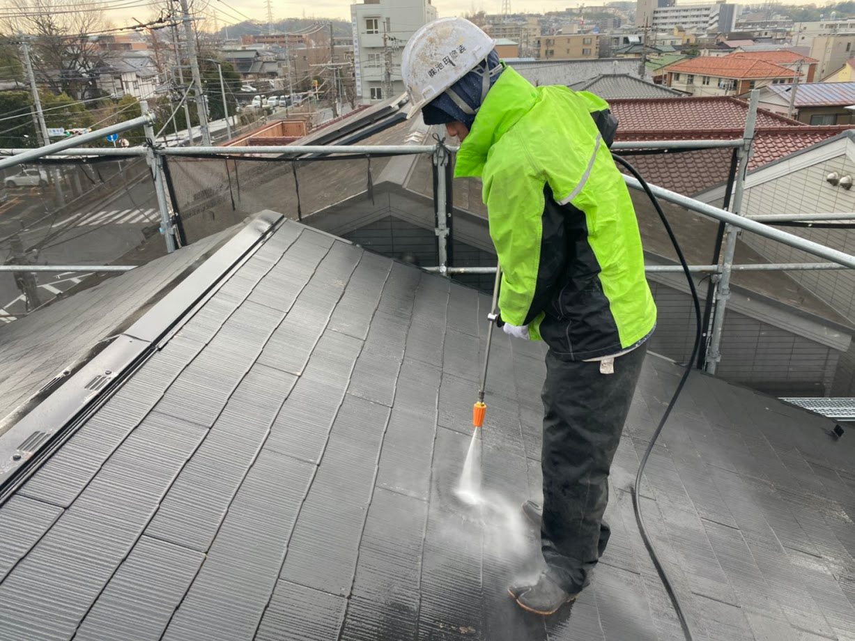 この洗浄でその後の塗料の持ちなどが違ってくるため、決して手の抜けない大切な作業です。 洗浄で屋根、外壁、さらに塀まで隅々まできれいにしていきます。 見ているだけでも気持ちの良い作業です。時々、