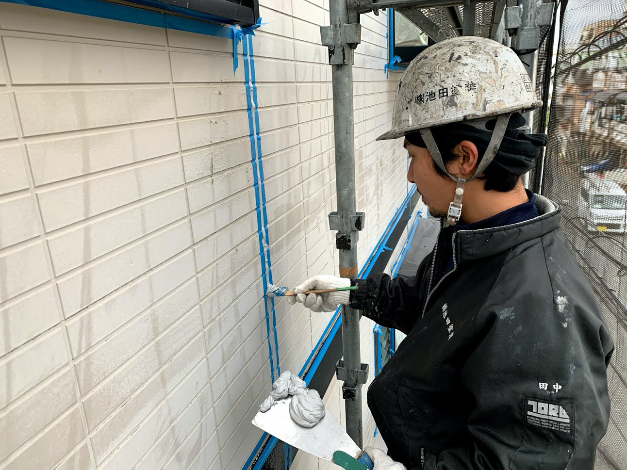 養生とは、塗装の種類を分けて塗るところをテープで区切り、塗装がはみ出ないようにする作業です。養生がきっちりできないと一人前とはいえません。
