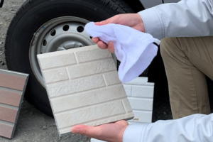 普通のサイディング【強く擦ると溶ける】   難付着サイディング【強く擦っても溶けない】