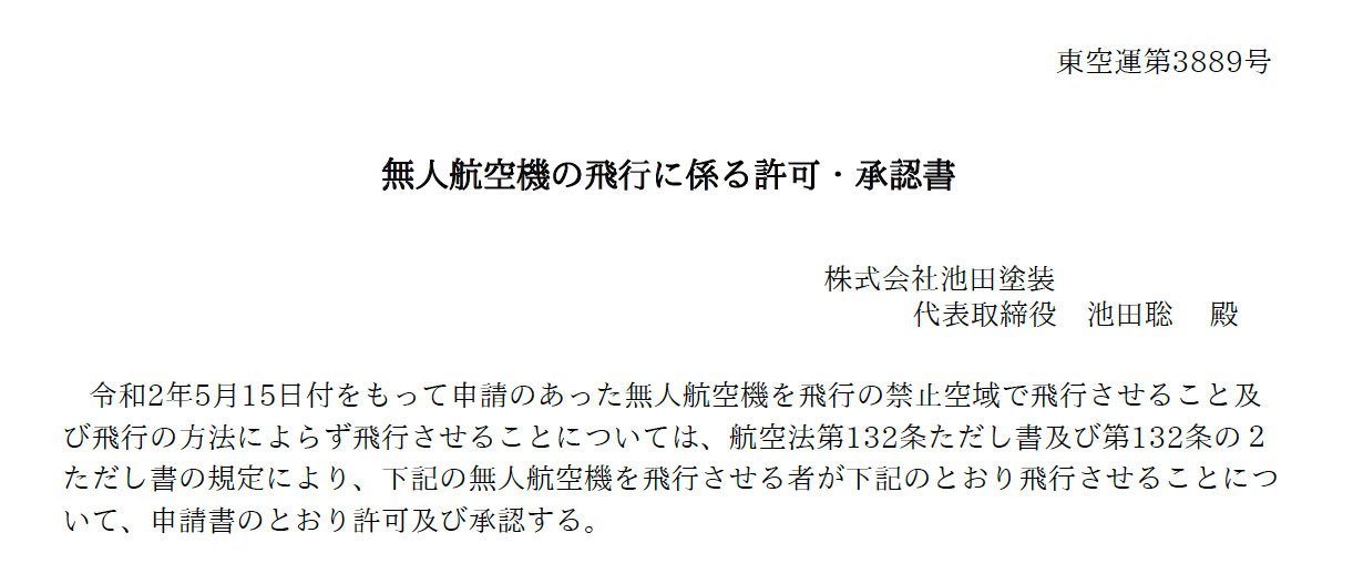 国土交通省に認可されています(「無人航空機の飛行に係る許可・承認書」)