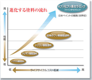 ここに、従来の3フッ化フッ素樹脂(3F)の性能をはるかにしのぐ世界初の「ファイン4Fセラミック」が誕生し、進化する次世代塗料として注目され始めたのです。