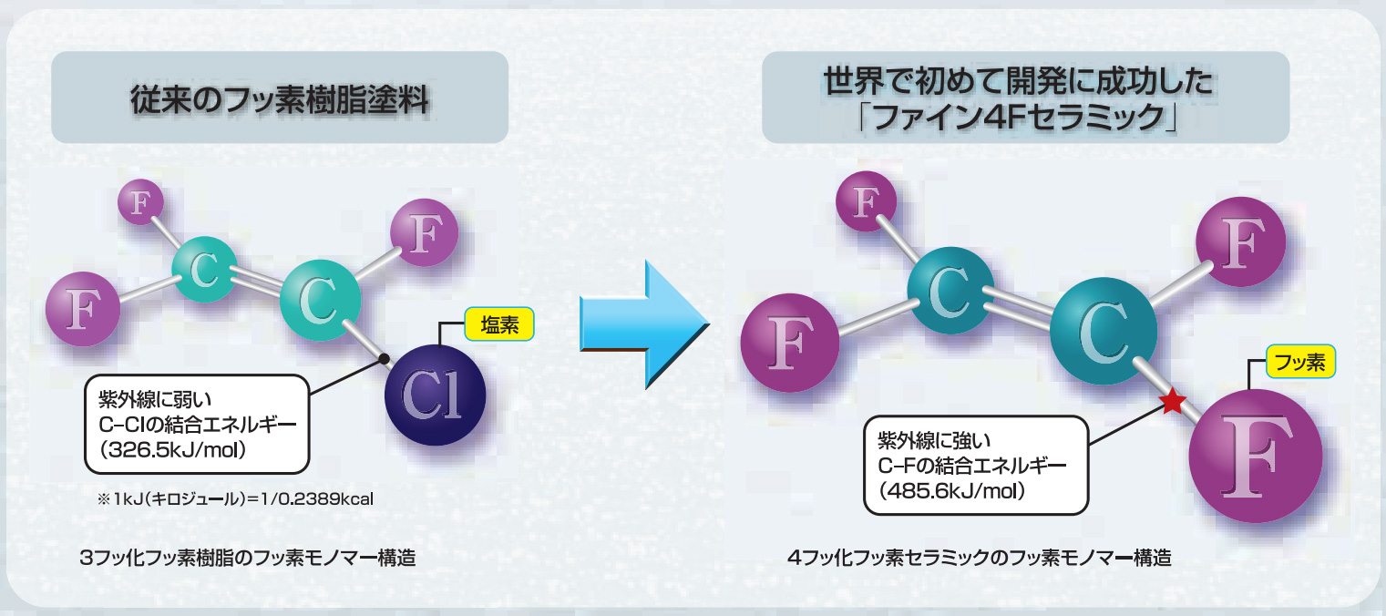 それまでは3Fタイプと呼ばれる3フッ化フッ素樹脂が主流。しかし、塩素原子による劣化の弱点が見られ、それを防ぐため、塩素原子の替わりに、もう一つのフッ素原子とセラミック変性樹脂(無機系)を加えるという画期的な発想を塗料技術に活かした結果、3フッ化フッ素の弱点を見事に克服できたのです(下図参照)。
