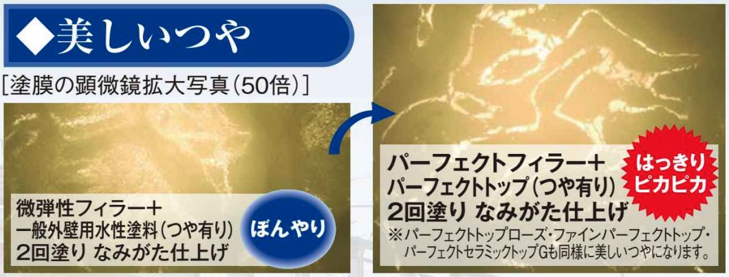 ポリマーが塗膜間の隙間を埋めるため、密でなめらかな塗膜形成が可能となり、すぐれた高光沢を実現できます。また、パーフェクトシリーズ下塗りと組み合わせることで美しい外観が得られます。