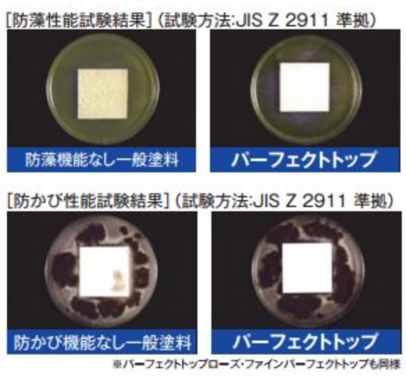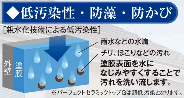 パーフェクトトップは低汚染性・防藻・防カビ機能を標準で有しています。 親水化技術により低汚染性を発揮することで雨だれ汚染に対してすぐれた効果を発揮します。