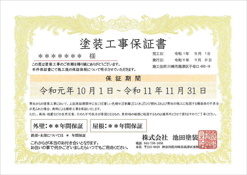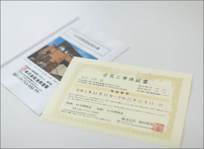 私たちは塗装の専門店。お客さまに「満足した!」と仰っていただいて施工完了。そして私たちの保証書は、その後のお付き合いの証(あかし)なのです。