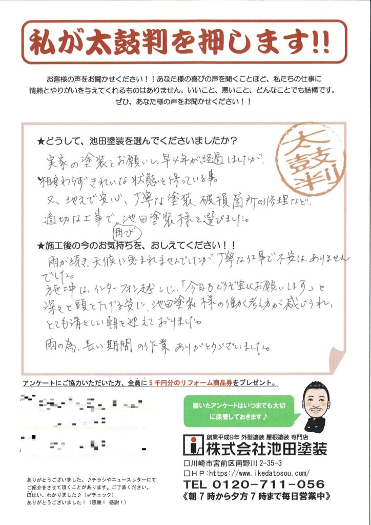 実家の塗装をお願いし、早4年が経過しましたが、相変わらずきれいな状態を保っている事。又、地元で安心、丁寧な塗装、破損個所の修理など、適切な工事で再び池田塗装様を選びました。