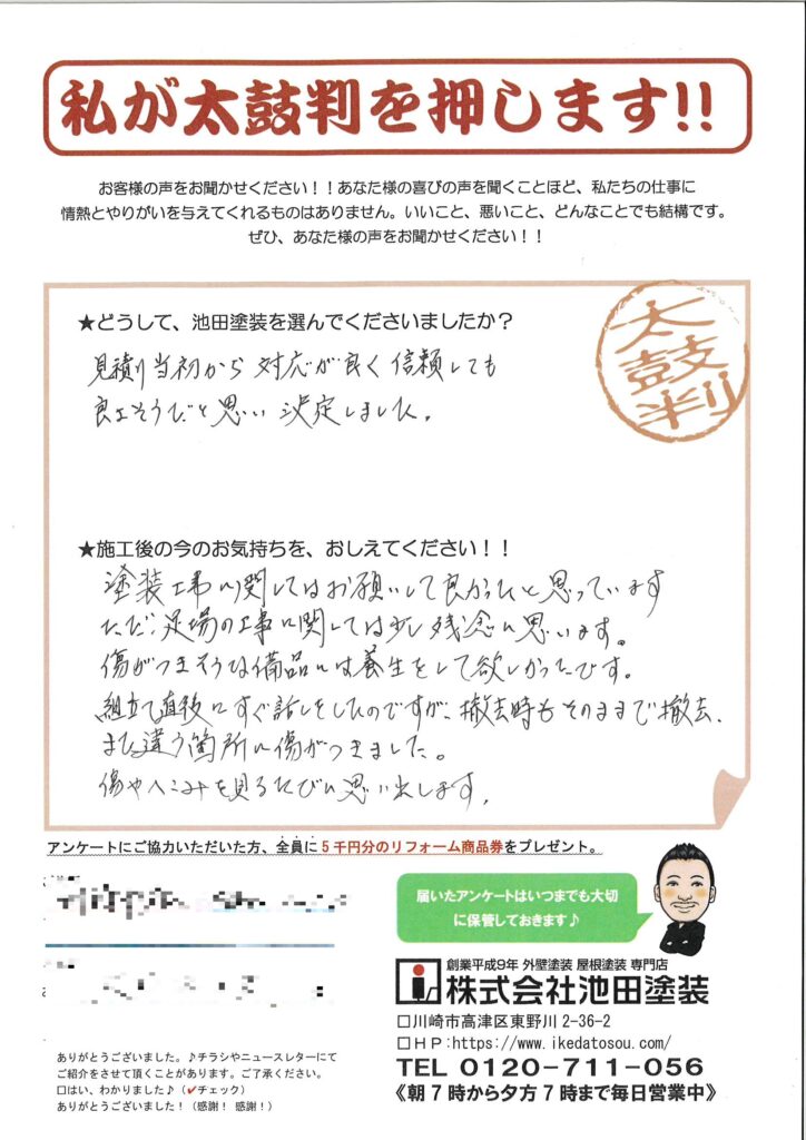 塗装工事に関してはお願いして良かったと思っています。ただ、足場の工事に関しては少し残念に思います。傷がつきそうな備品には養生して欲しかったです。