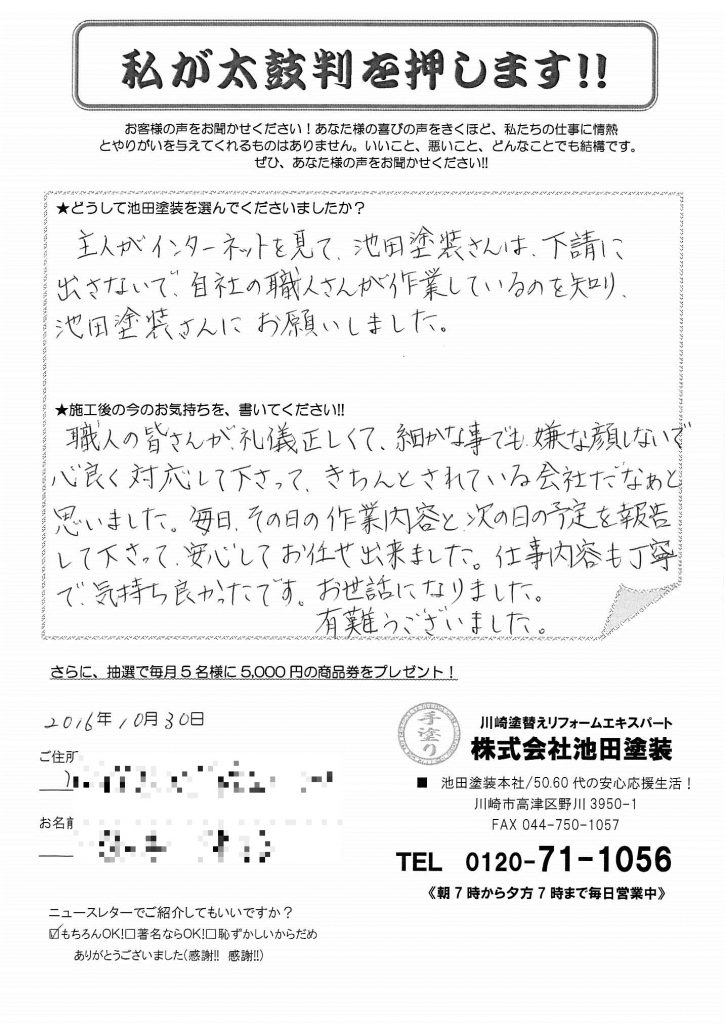 主人がインターネットを見て、池田塗装さんは、下請に出さないで、自社の職人さんが作業しているのを知り、池田塗装さんにお願いしました。