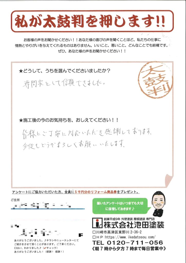 池田塗装さんの営業さんから職人さん、私の家に携わってくれた皆さんがとても丁寧で誠意ある対応してくれ、外壁塗装も新築同様に仕上げてもらって感謝しかありません。