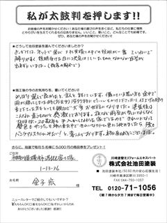 やっぱり選んで良かったと、主人と話しています。働いている若い方も途中で雨が降ってしまった時も(外出中)洗濯物にビニールをかけて下さったり、仕上げの時の来て下さった方もとっても親切で大変お世話になりました。塗装後はこんなに違うものかと、感激しております。夜など雨音が気にならなくなりました。20数年も手入れしなかった家でしてのできれいになって壁色もサンプルを持って来た中できれいなクリーム色にきめましたら、孫もバニラアイスクリームみたい!と、喜んでおります。本当にありがとうございまいした。