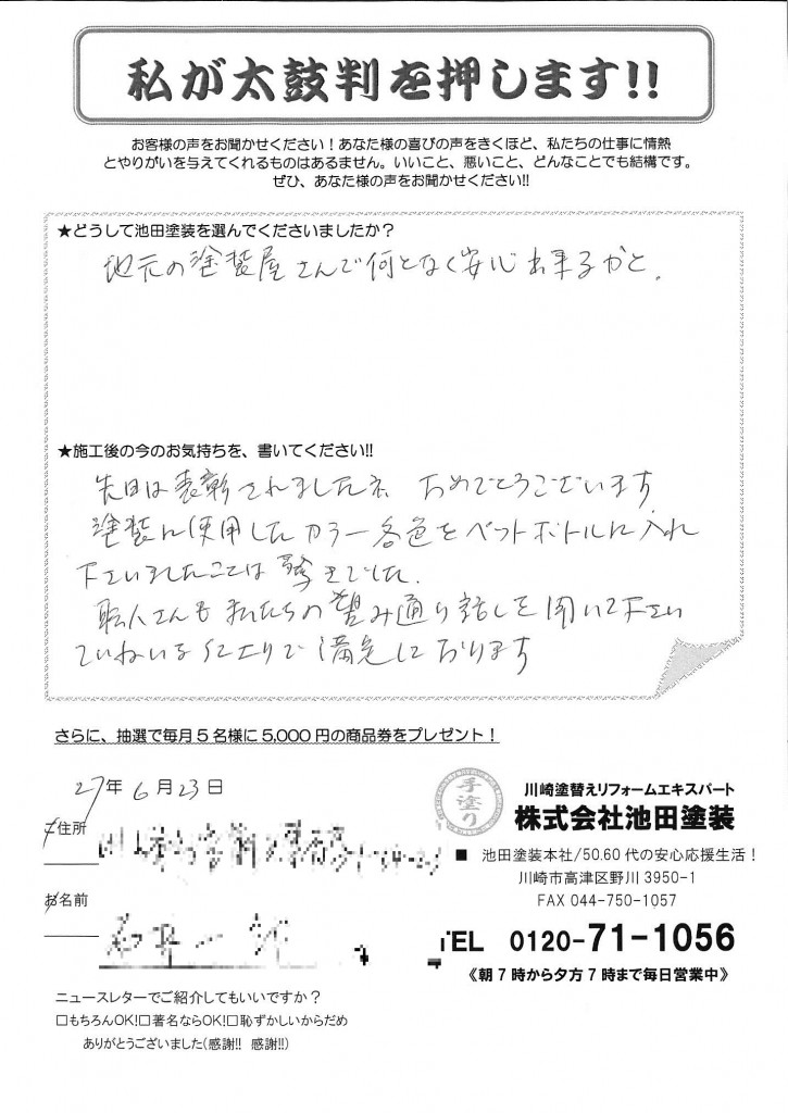 先日は表彰されましたね、おめでとうございます。塗装に使用したカラー各色をペットボトルにいれて下さいましたことは驚きでした。職人さんも私たちの望み通り話を聞いてくり、ていねいな仕上がりで満足しております。