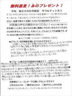 2年前にチラシを見て見積もりを取った所、他社さんよりも30~40万円位安かった事と屋根の塗装も他社さんよりも20万円位安かったので、こちらを選びました。