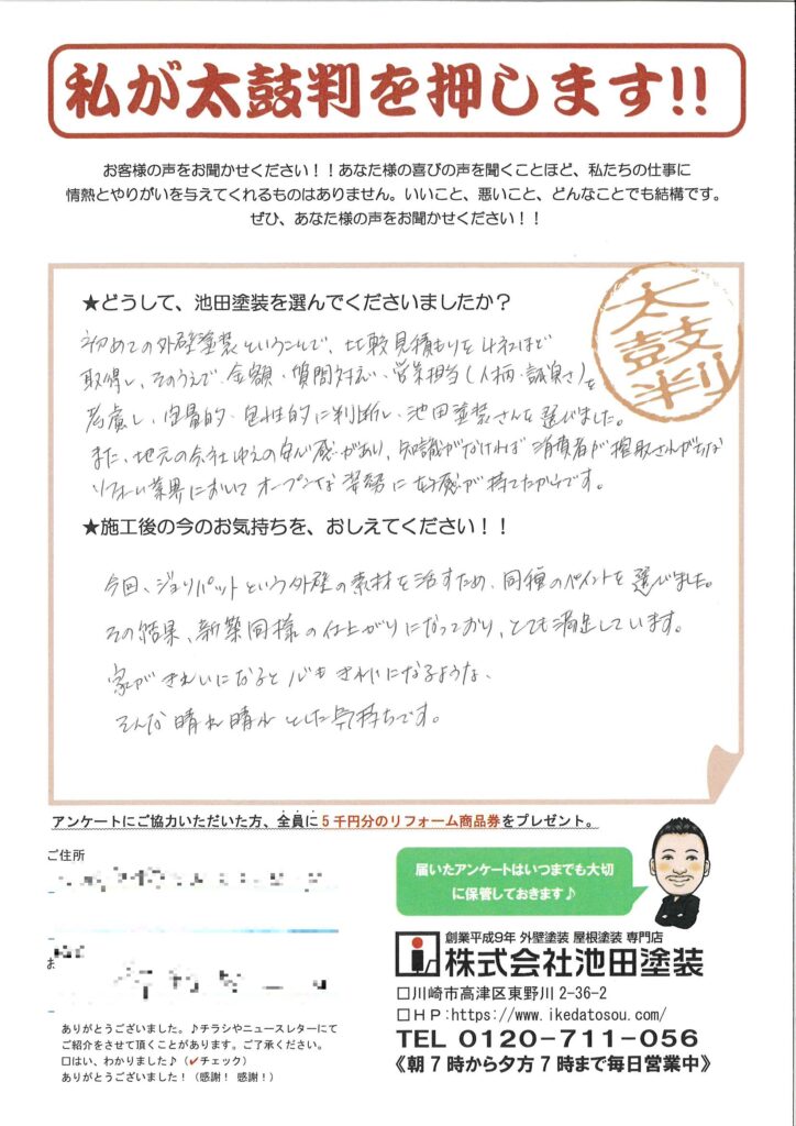 初めての外壁塗装ということで、比較見積りを4社ほど取得し、そのうえで金額、質問対応、営業担当(人柄、誠実さ)を考慮し、定量的、包性的に判断し池田塗装さんを選びました。また、地元の会社ゆえの安心感があり、知識がなければ消費者が摂取されがちなリフォーム業界においてオープンな姿勢に好感が持てたからです。