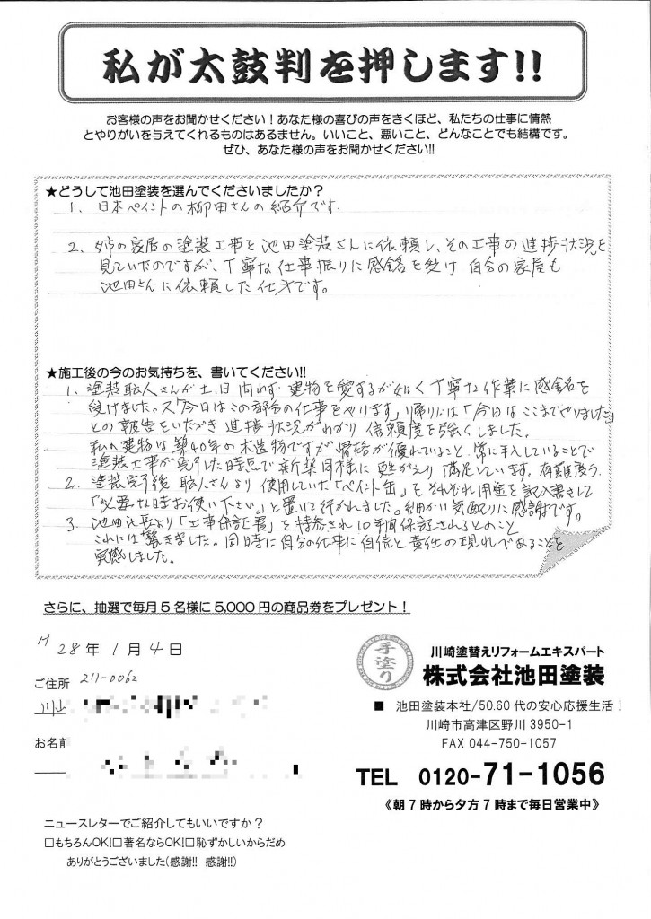 2.姉の家居の塗装工事を池田塗装さんに依頼し、その工事の進捗状況を見ていたのですが、丁寧な仕事振りに感銘を受け自分の家屋も池田さんに依頼したのです。