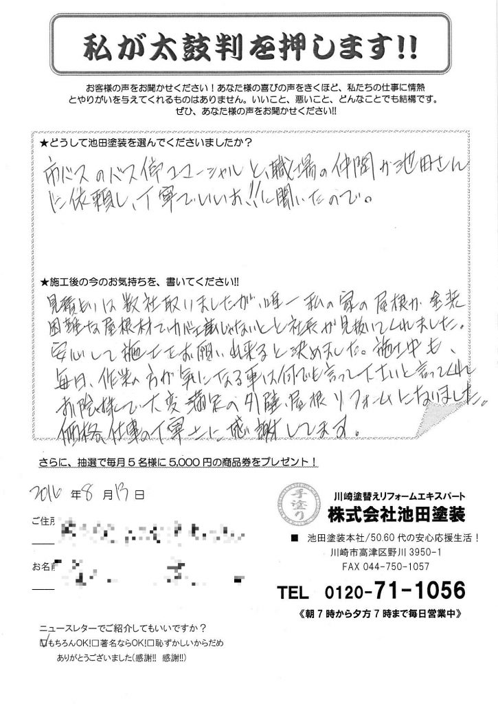 ハウスメーカーの見積があまりにも高かったので、複数社相見積もりを実施したところ、価格も安く、説明も丁寧だった池田塗装さんに屋根・外壁塗装をお願いしました。