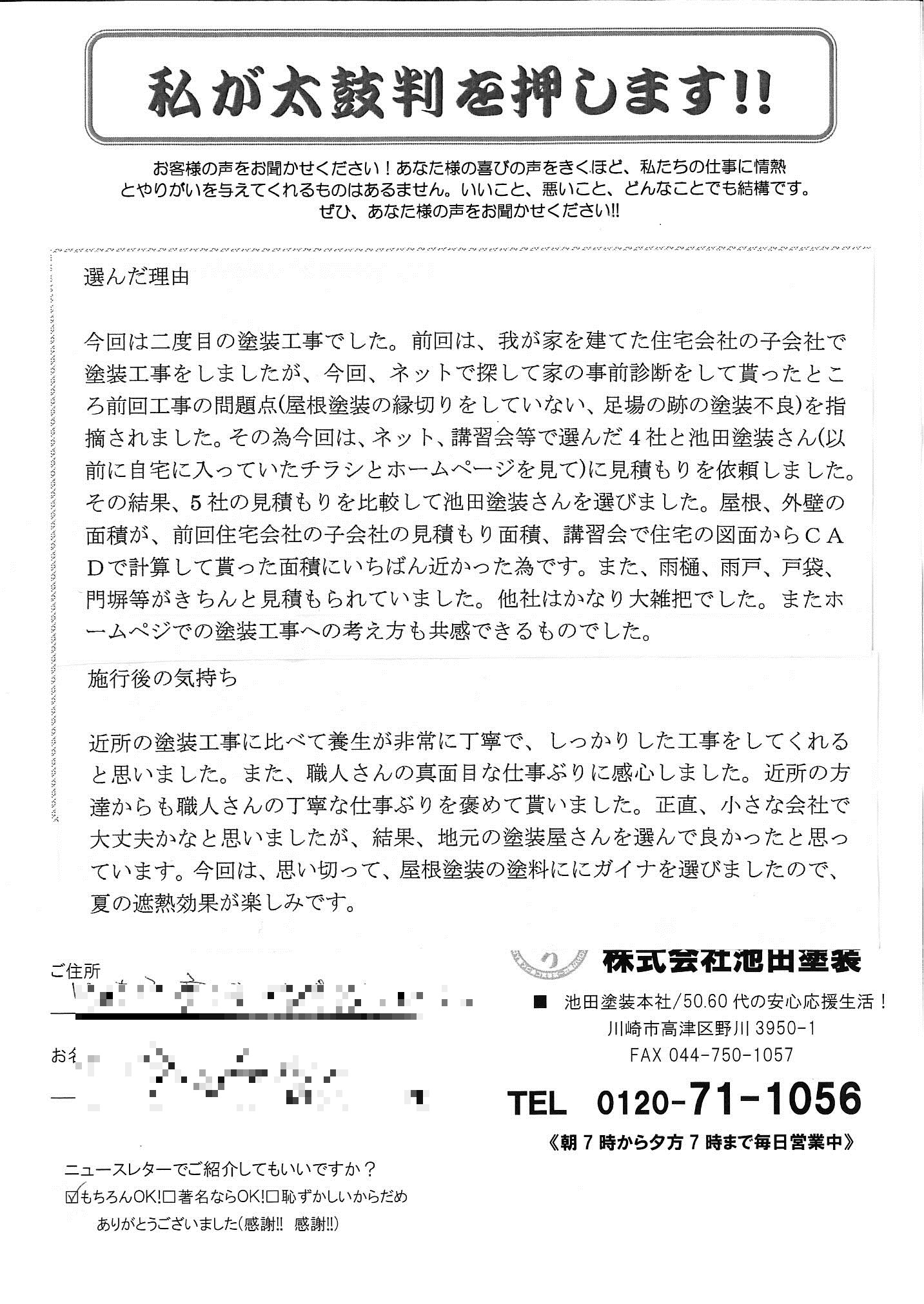 今回は二度目の塗装工事でした。前回は、我家を建てた住宅会社の子会社で塗装工事をしましたが、今回、ネットで探して家の事前診断をして貰ったところ前回工事の問題点(屋根塗装の縁切りをしていない、足場の跡の塗装不良)を指摘されました。その為今回は、ネット、講習会等で選んだ4社と池田塗装さん(以前に自宅に入っていたチラシとホームぺージを見て)に見積りを依頼しました。その結果、5社の見積りを比較して池田塗装さんを選びました。屋根、外壁の面積が、前回住宅会社の子会社の見積り面積、講習会で住宅の図面からCADで計算して貰った面積にいちばん近かった為です。また、雨樋、雨戸、戸袋、門塀等がきちんと見積もられていました。他社はかなり大雑把でした。またホームページでの塗装工事への考え方も共感できるものでした。