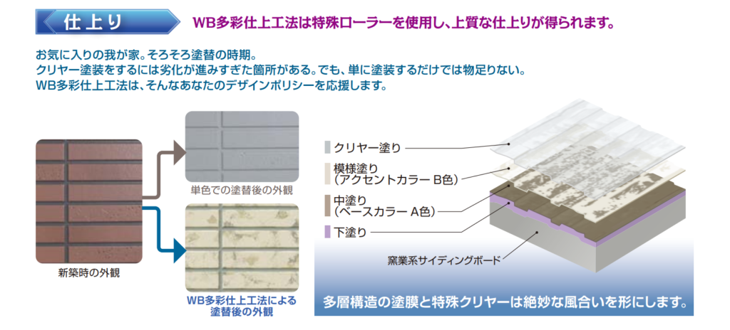これまで、サイディングボードの塗替え方法は一色塗、二色塗分け工法、クリヤー塗装と大きく分けて3パターンの工法しかありませんでした。しかし、このWB多彩仕上工法により高級感あふれる上質な仕上げを実現することが可能となりました。