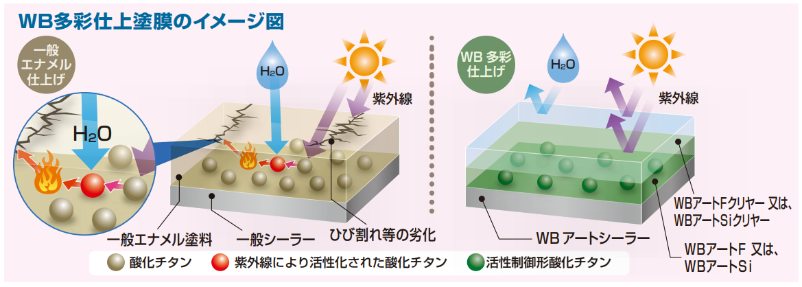 - WBアートFは反応硬化型フッ素樹脂、WBアートsiは反応硬化型アクリルシリコン樹脂を使用しており、さらに光安定剤を配合することで優れた耐候性を発揮します。